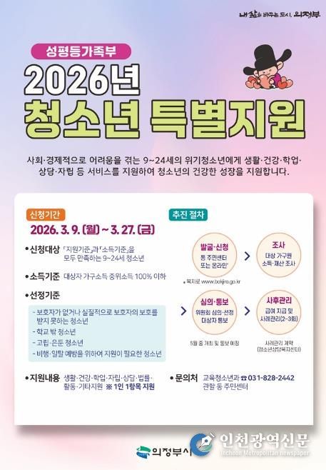 [인천광역신문] 관리자 기자 | 의정부시는 3월 9일부터 27일까지 ‘2026년 청소년 특별지원’ 사업 대상자를 모집한다.