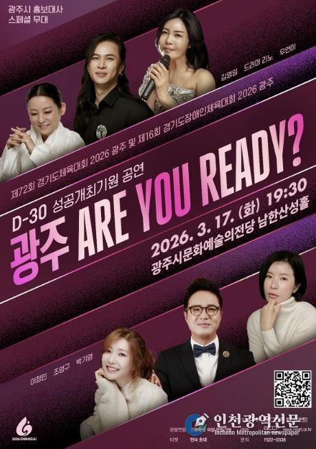 [인천광역신문] 관리자 기자 | 광주시문화재단은 오는 17일 ‘제72회 경기도체육대회 및 제16회 경기도장애인체육대회 2026 광주’의 성공 개최를 기원하고 대회 개막 30일 전을 기념하는 ‘광주 ARE YOU READY?’ 공연을 개최한다고 6일 밝혔다.