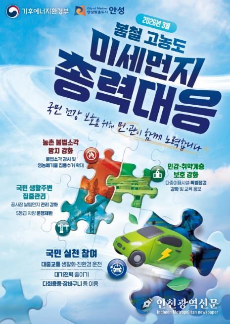 [인천광역신문] 관리자 기자 | 안성시는 고농도 미세먼지 발생이 빈번한 봄철을 맞아 시민 건강 보호를 위해 3월 한달 간 ‘초미세먼지 봄철 총력대응’을 추진한다고 밝혔다.