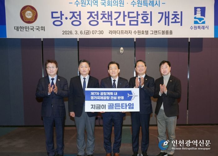 [인천광역신문] 관리자 기자 | 이재준 수원특례시장은 6일 라마다프라자 수원호텔에서 열린 지역 국회의원들과 당·정 정책간담회에서 “제7차 공항개발 종합계획에 ‘경기국제공항’ 건설 내용이 반영될 수 있도록, 경기도와 협의해 달라”고 요청했다.