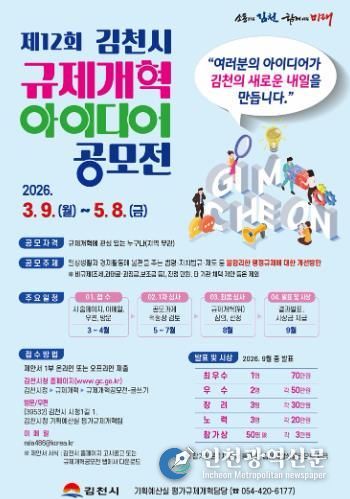 [인천광역신문] 관리자 기자 | 김천시는 시민의 아이디어를 바탕으로 일상생활과 기업활동 과정에서 발생하는 불합리한 규제를 개선하기 위해 제12회 규제개혁 아이디어 공모전을 개최한다.