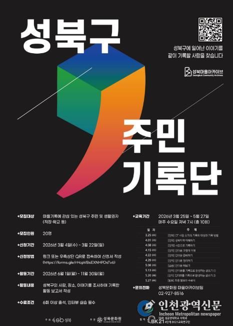[인천광역신문] 관리자 기자 | 서울 성북구가 성북구 주민기록단 교육생을 모집한다. 성북구는 성북문화원과 함께 성북구의 다양한 모습을 기록하는 성북구 주민기록단을 교육·운영하고 있다.