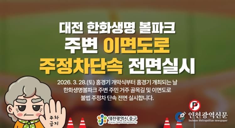 [인천광역신문] 관리자 기자 | 대전 중구는 대전 한화생명 볼파크 야구 홈경기 개막전이 열리는 오는 28일부터‘대전 한화생명 볼파크’주변의 불법주정차 단속을 전면 시행한다고 밝혔다.
