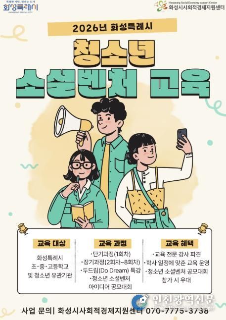 [인천광역신문] 관리자 기자 | 화성특례시는 관내 초·중·고등학생을 대상으로 2026년 청소년 소셜벤처 교육을 실시한다. 이번 교육은 청소년들에게 사회적경제에 대한 이해를 높이고 지역사회 다양한 사회문제에 관심을 갖고 해결 방안을 제안하는 체인지메이커로 성장하도록 돕기 위해 마련됐다.