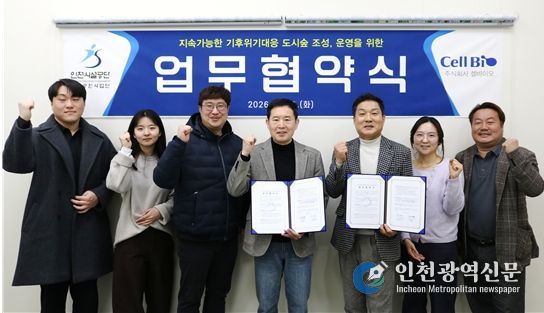[인천광역신문] 관리자 기자 | 인천시설공단 청라공원사업단이 지난 10일, 한국서부발전 사내벤처 ㈜셀바이오(대표이사 변형완)와 함께 업무협약을 체결하고 민관 협력을 통한 도시숲 조성과 공원 관리 효율화에 나선다.