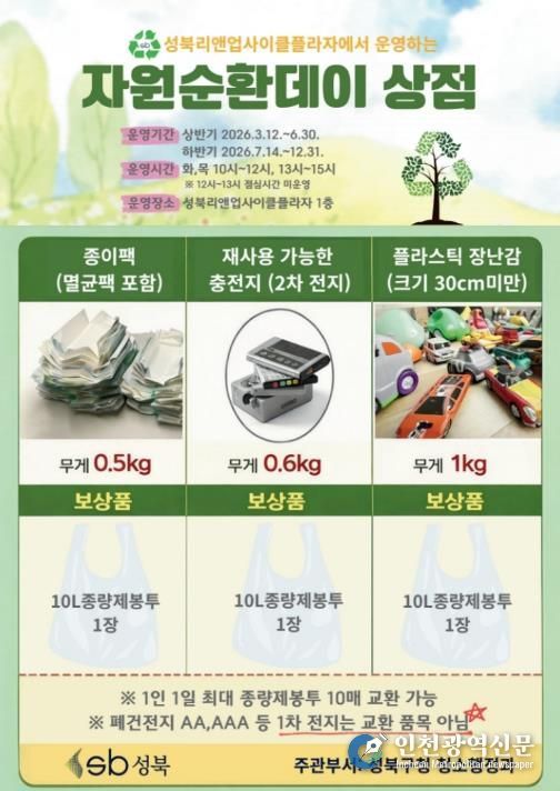 [인천광역신문] 관리자 기자 | 서울 성북구가 주민들의 자원 순환 참여를 촉진하고 올바른 분리배출 문화를 확산하기 위해 3월 12일부터 성북리앤업사이클플라자 1층에서 ‘자원순환데이 상점’을 운영한다.