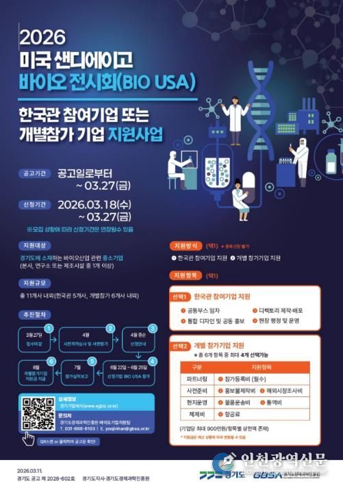 [인천광역신문] 관리자 기자 | 경기도가 경기도경제과학진흥원과 함께 ‘2026년 미국 샌디에이고 바이오 전시회(이하 BIO USA)’에 참가할 바이오 중소기업을 모집한다.