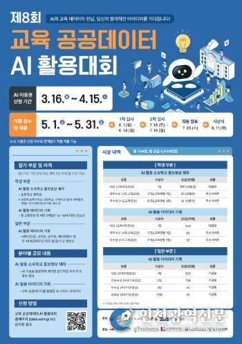 [인천광역신문] 관리자 기자 | 부산광역시교육청은 교육 공공데이터와 인공지능(AI)을 결합한 창의적 아이디어를 발굴하기 위한 ‘제8회 교육 공공데이터 AI활용대회’를 개최한다고 밝혔다.