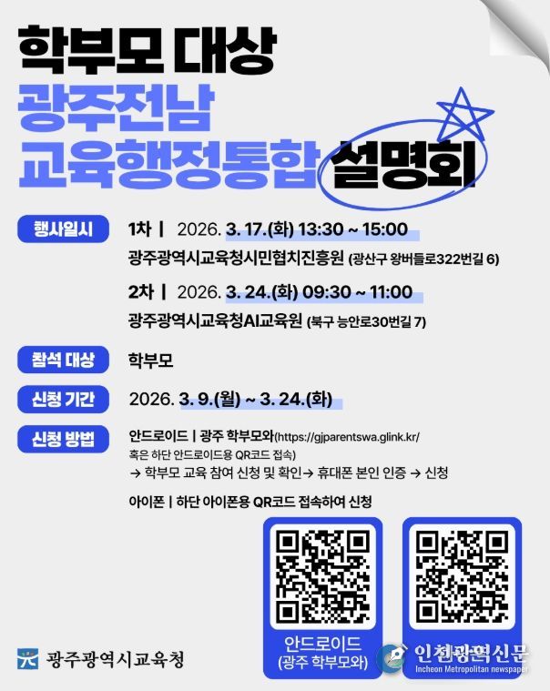 [인천광역신문] 관리자 기자 | 광주시교육청이 학부모의 교육행정통합 궁금증을 해소하기 위해 두 차례에 걸쳐 ‘광주·전남 교육행정통합 설명회’를 개최한다.