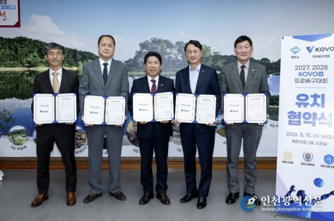 [인천광역신문] 관리자 기자 | 한국배구연맹에서 주최하는 KOVO컵 프로배구대회가 2027, 2028년 2년 연속 제천시에서 개최된다. 제천시는 11일 한국배구연맹(KOVO)과 '2027, 2028 제천·KOVO컵 프로배구대회' 유치 협약을 체결하고 대회 개최를 공식 확정했다.