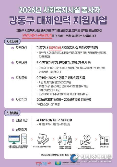[인천광역신문] 관리자 기자 | 서울 강동구는 소규모 사회복지시설의 업무 공백을 줄이고 종사자의 휴식권을 보장하기 위해 ‘사회복지시설 종사자 대체인력 지원사업’을 추진한다고 밝혔다.