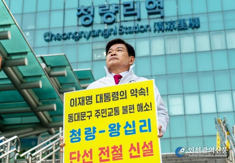 [인천광역신문] 관리자 기자 | 서울 동대문구는 12일 청량리역 광장과 이삭공원 일대에서 수인분당선 단선전철 신설을 촉구하는 1인 피켓 시위를 벌였다. 청량리와 왕십리를 잇는 선로는 불과 1km 남짓. 하지만 그 짧은 구간이 서울 동북권 주민들의 강남길을 틀어막고 있다는 게 동대문구의 판단이다. 출근길 시민들 앞에 구청장이 직접 선 것도, 이 문제가 더는 행정 문서 안에만 머물 일이 아니라는 뜻을 드러내기 위해서였다.