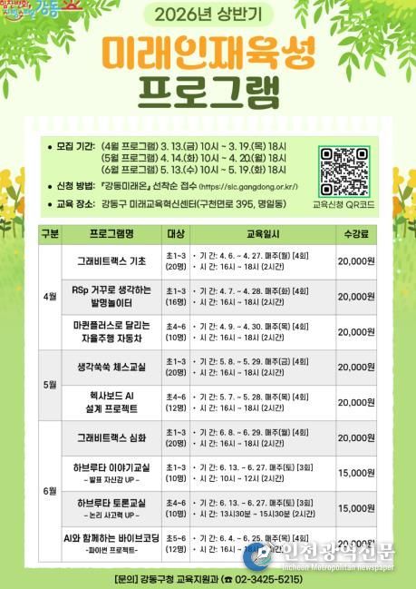 [인천광역신문] 관리자 기자 | 서울 강동구는 초등학생의 창의적 사고력과 문제해결 역량을 키우기 위해 2026년 상반기 ‘미래인재 육성 프로그램’을 운영한다고 밝혔다.
