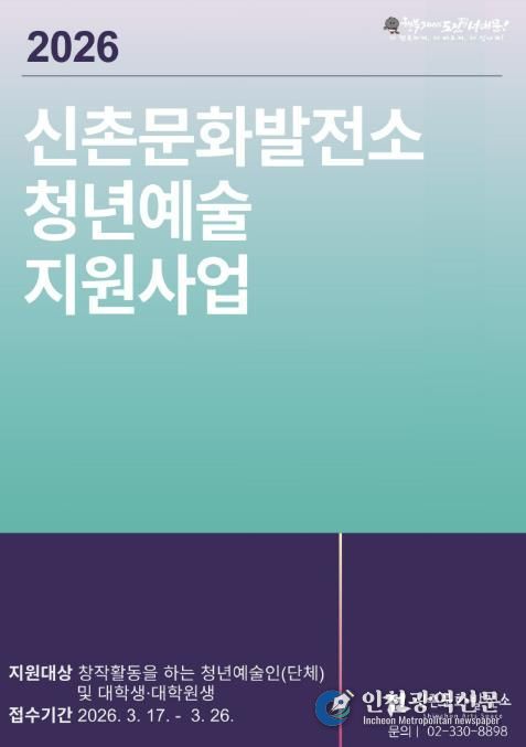 구는 ‘2026 신촌문화발전소 청년예술 지원사업’에 참여할 청년예술가 및 예비예술가를 이달 17일부터 26일 오후 6시까지 공개 모집한다.