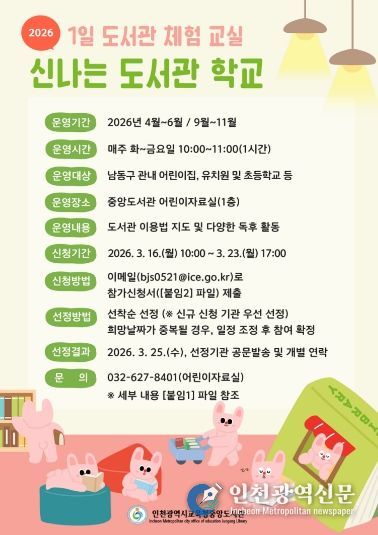[인천광역신문] 관리자 기자 | 인천광역시교육청중앙도서관은 오는 16일부터 남동구 관내 어린이집, 유치원 및 초등학교를 대상으로 1일 도서관 체험교실 ‘신나는 도서관 학교’ 참여 기관을 모집한다.