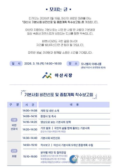 아산시는 오는 3월 19일 오후 2시 모나밸리 아레나홀에서 ‘아산형 기본사회 비전 선포식 및 5개년 종합계획 착수보고회’를 개최한다고 밝혔다.
