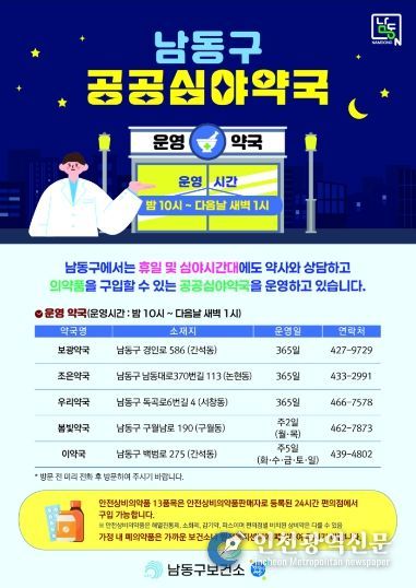 [인천광역신문] 관리자 기자 | 인천시 남동구가 심야시간대 의약품 구입 불편을 해소하고, 안전하고 편리한 공공보건의료 서비스를 제공하기 위해 ‘공공심야약국’을 운영한다고 16일 밝혔다.