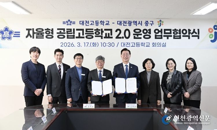[인천광역신문] 관리자 기자 | 대전 중구는 17일 대전고등학교(교장 김기신)와 지역교육 기반 강화를 위한 상호교류 협력 협약을 체결하고, 지역과 학교가 유기적으로 소통하며 함께 성장하는 교육공동체 구축에 나섰다고 밝혔다.