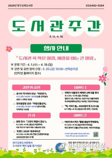[인천광역신문] 관리자 기자 | 양구교육도서관(관장 김훈)은 4월 12일부터 18일까지의 도서관 주간을 맞아 지역 주민과 학생들이 함께 참여할 수 있는 다양한 독서·문화 행사를 운영한다.