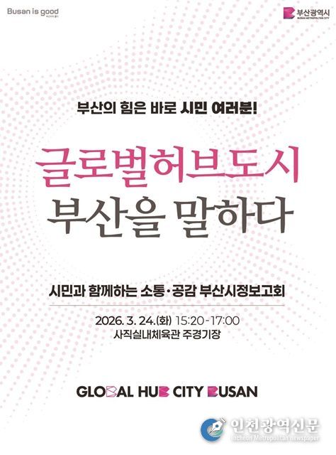 [인천광역신문] 관리자 기자 | 부산시는 오는 24일 오후 3시 20분 사직실내체육관 주경기장에서 시민과 지역 주요 인사 등이 참석한 가운데 '글로벌허브도시 부산을 말하다' 시정보고회를 개최한다고 밝혔다.