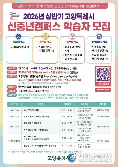 [인천광역신문] 관리자 기자 | 고양특례시는 ‘2026년 고양시 신중년캠퍼스’ 상반기 교육과정 학습자 180명을 오는 3월 23일부터 모집한다.