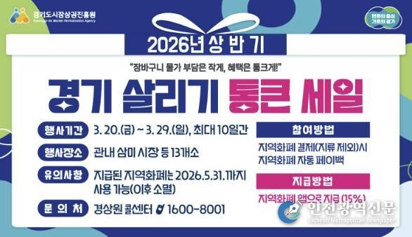 [인천광역신문] 관리자 기자 | 시흥시는 고물가로 위축된 민생경제에 활력을 불어넣고 소상공인의 매출 증대를 돕기 위해 오는 3월 20일부터 29일까지 관내 전역에서 ‘2026년 상반기 경기 살리기 통큰 세일’을 개최한다.