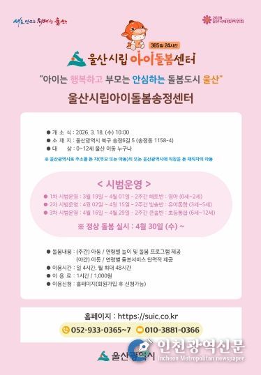 [인천광역신문] 관리자 기자 | 울산시가 365일 24시간 긴급 돌봄 서비스를 제공하는 공공 아이돌봄시설을 북구에 추가로 마련했다.