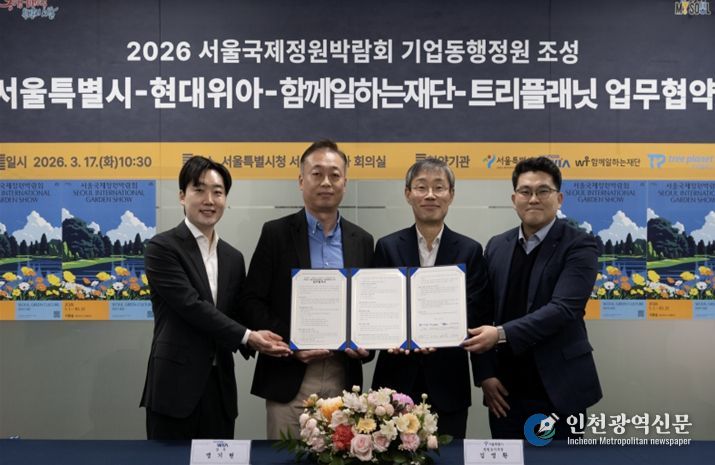 [인천광역신문] 관리자 기자 | 서울시는 현대위아, 함께일하는재단, 트리플래닛과 5월 1일 개막하는 ‘2026 서울국제정원박람회’의 기업동행정원 업무협약(MOU)을 3월 17일 서울시청에서 체결했다.