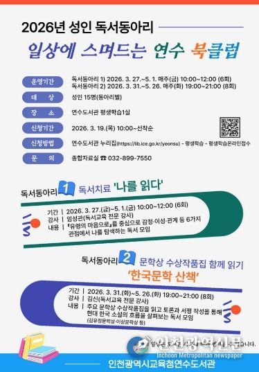 [인천광역신문] 관리자 기자 | 인천광역시교육청연수도서관은 지역사회의 건강한 독서문화 조성을 위해, 오는 27일부터 성인 독서동아리 ‘일상에 스며드는 연수 북클럽’을 운영한다.