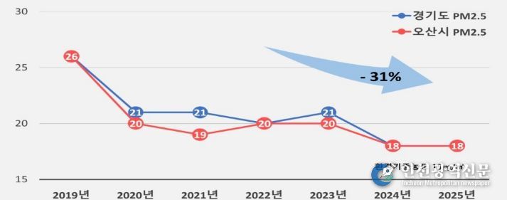 시에 따르면 오산시의 초미세먼지 연평균 농도는 2019년 이후 경기도 평균 수준을 유지하고 있으며, 보다 쾌적한 대기환경 조성을 위해 지속적인 관리와 개선 노력을 이어가고 있다. 시는 2026년 초미세먼지 연평균 농도 17㎍/㎥ 달성을 목표로 총력을 기울일 방침이다.