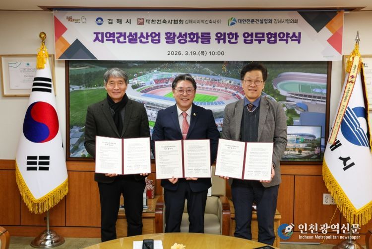 [인천광역신문] 관리자 기자 | 김해시는 지역건설산업 활성화와 지역경제 발전을 위해 19일 오전 10시 시장실에서 대한건축사협회 김해시지역건축사회, 대한전문건설협회 김해시협의회와 ‘지역건설산업 활성화를 위한 3자 업무협약’을 체결했다.