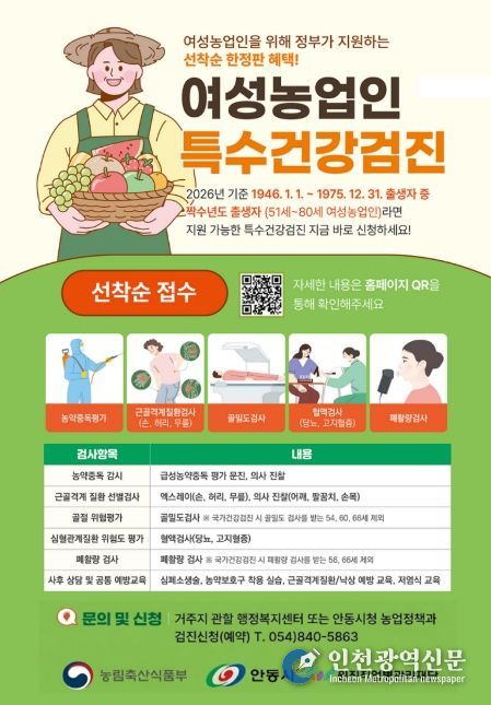 [인천광역신문] 관리자 기자 | 안동시는 여성농업인의 농작업 질환을 예방하고 전문적인 건강관리를 지원하기 위해 ‘2026년 여성농업인 특수건강검진사업’을 본격 추진한다.