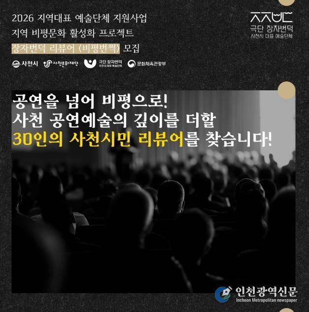 [인천광역신문] 관리자 기자 | 사천시, 사천문화재단, 극단 장자번덕이 사천 공연예술의 깊이를 더할 시민 리뷰어 프로그램 '비평번쩍'에 참여할 사천 시민 30명을 오는 4월 3일까지 모집한다.
