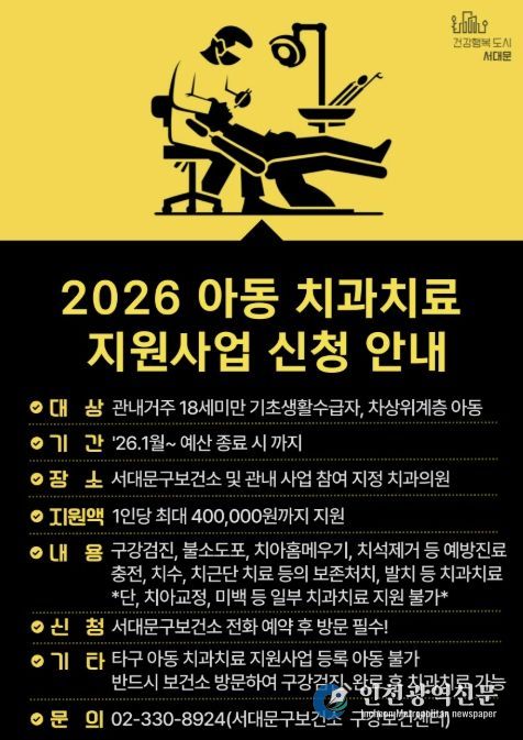 [인천광역신문] 관리자 기자 | 서대문구가 취약계층 아동의 구강건강을 위해 ‘아동 치과 치료 지원사업’을 확대 추진한다고 20일 밝혔다.