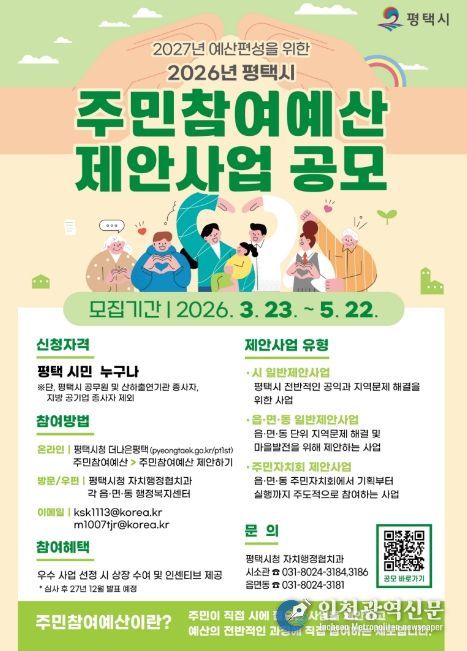[인천광역신문] 관리자 기자 | 평택시가 3월 23일부터 5월 22일까지 2027년도 예산 편성을 위한 2026년도 주민참여예산 제안사업 공모를 시행한다.