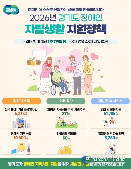 경기도가 장애인이 스스로 삶을 선택하고 주도적으로 살아갈 수 있도록 올해 역대 최대 규모인 1조 7,749억 원의 예산을 투입해 일자리, 거주공간, 자립 전·후 생활지원 등 3대 영역 43개 사업을 추진한다.