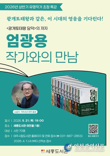 [인천광역신문] 관리자 기자 | 여주시는 오는 5월 21일 오후 7시 세종도서관에서 대하소설 '광개토태왕 담덕'의 저자, 엄광용 작가를 초청하여 작품과 작가의 세계관에 대해 시민들과 이야기하는 ‘엄광용 작가와의 만남’을 운영한다.