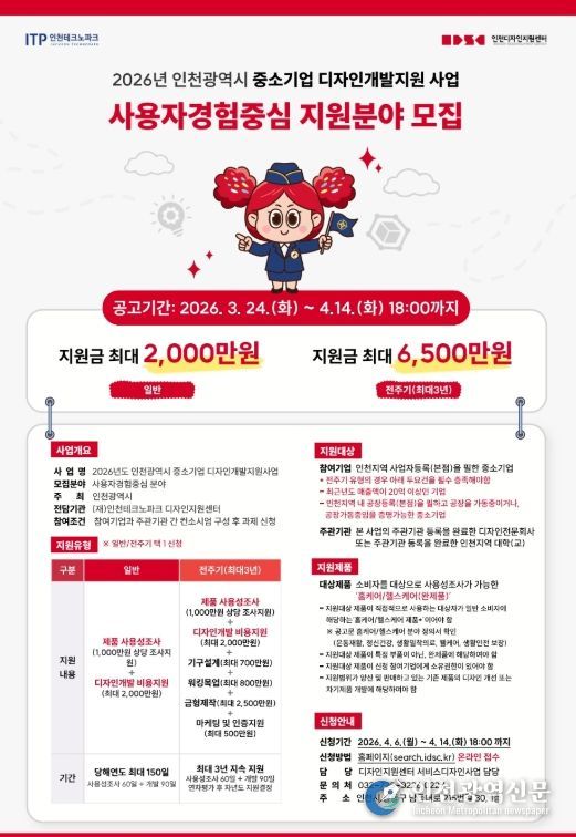 [인천광역신문] 관리자 기자 | 인천테크노파크(인천TP)는 중소기업의 홈·헬스케어 제품을 소비자 중심으로 개발할 수 있도록 돕는 ‘2026년 인천광역시 중소기업 디자인개발지원사업 사용자경험중심 지원분야’의 참여기업을 24일부터 모집한다고 밝혔다.