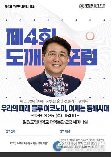 [인천광역신문] 관리자 기자 | 강원도립대학교는 '주문진 도깨비 포럼: 우리 시대의 명사가 전하는 말' 제4회 행사를 오는 3월 25일 오후 3시, 강원도립대학교 대학본관 2층 세미나실에서 개최한다.