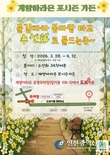 [인천광역신문] 관리자 기자 | 인천광역시 계양구는 봄을 맞아 계양아라온 일대에 대규모 꽃 식재를 완료하고, 포시즌가든을 중심으로 수선화가 개화하기 시작하며 화사한 봄 경관을 선보이고 있다고 밝혔다.