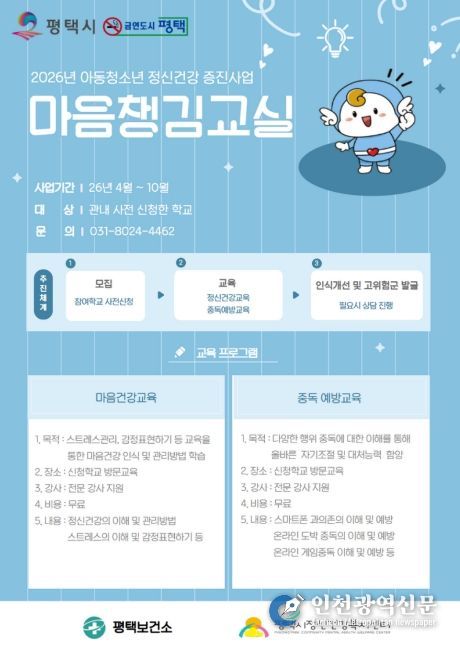 [인천광역신문] 관리자 기자 | 평택시는 스쿨케어 사업의 일환으로 관내 학교 학생들을 대상으로 『마음챙김교실』을 운영한다고 밝혔다. 이번 프로그램은 학생들이 교육을 통해 정신건강을 올바르게 인식하고 스스로 관리할 수 있도록 지원함으로써 마음 건강 증진을 도모하는 데 목적이 있다.