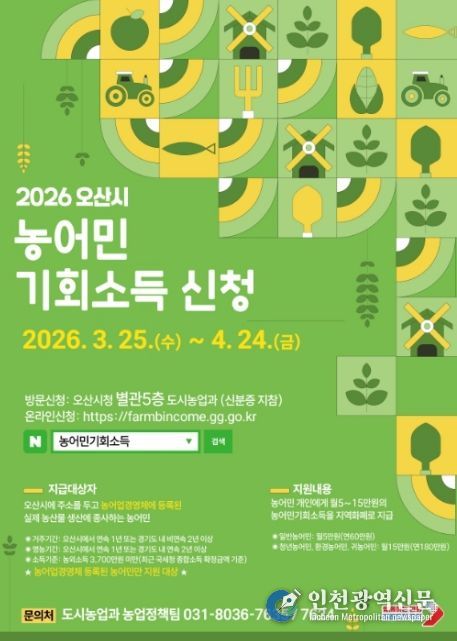 [인천광역신문] 관리자 기자 | 오산시는 농업·농촌의 공익적 가치 보장과 농어촌 소멸위기 대응을 위해 ‘2026년 농어민 기회소득’ 신청·접수를 3월 25일부터 4월 24일까지 진행한다고 밝혔다.