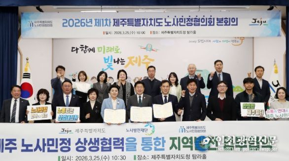 제주특별자치도는 25일 도청 탐라홀에서 2026년 제1차 제주노사민정협의회 본회의를 열어 ‘산업대전환 대응과 일터 위험격차 해소를 위한 제주특별자치도 노사민정 공동선언문’을 채택하고, 노사발전재단과 상생협력 업무협약을 체결했다.