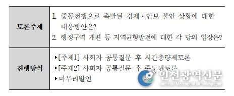 '공직선거법'제82조의3에 따라 개최하는 이번 토론회는 총 5개 정당이 참여하여 ▲ ‘중동전쟁으로 촉발된 경제·안보 불안 상황에 대한 대응방안’, ▲ ‘행정구역 개편 등 지역균형발전에 대한 각 당의 입장’을 주제로 토론할 예정이다.