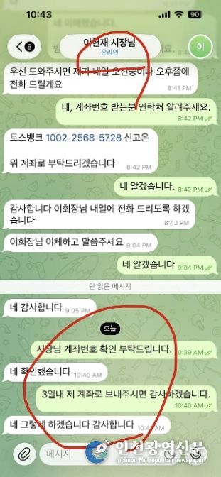 [인천광역신문] 관리자 기자 | 하남시가 이현재 하남시장의 모바일 메신저 ‘텔레그램’ 계정이 해킹됨에 따라 이를 악용한 금전 편취 시도가 이어지고 있다며 시민들에게 각별한 주의를 당부했다.
