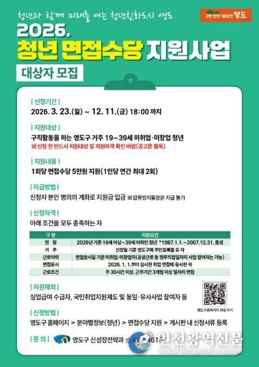 [인천광역신문] 관리자 기자 | 부산 영도구가 미취업 청년들의 구직 활동을 실질적으로 돕기 위해 ‘2026년 청년 면접수당 지원사업’을 시행한다.