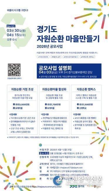[인천광역신문] 관리자 기자 | 경기도가 주민 주도의 자원순환 실천 확산을 위해 ‘2026년 자원순환마을 만들기’ 공모사업을 추진하고, 오는 3월 30일부터 참여 공동체를 모집한다. 이번 사업은 마을 단위에서 발생하는 생활폐기물 문제를 주민 스스로 해결하고 지속가능한 순환경제 체계를 구축하는 주민참여형 모델이다.