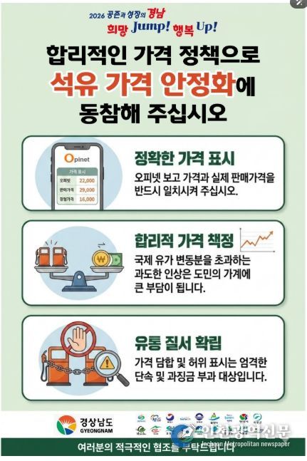 권대혁 경남도 에너지산업과장은 “정부의 강력한 물가 안정 대책과 유류세 인하 조치가 현장에 신속히 반영되도록 관리하고 있다”며, “도민 부담 완화를 위해 현장 점검과 가격 모니터링을 지속하겠다”고 말했다.