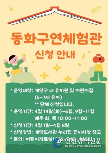 [인천광역신문] 관리자 기자 | 인천광역시교육청계양도서관은 4월 1일부터 계양구 관내 어린이집과 유치원(5~7세)을 대상으로 ‘동화구연 체험관’에 참여할 기관을 모집한다.