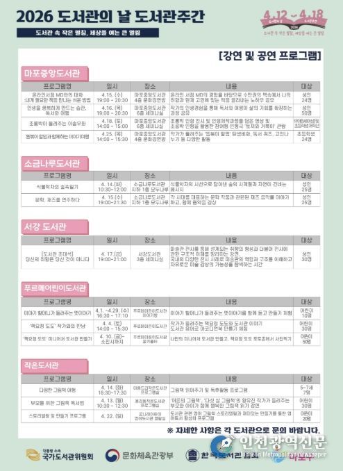 [인천광역신문] 관리자 기자 | 마포구는 도서관의 날(4월 12일)과 도서관 주간(4월 12일~18일)을 맞아 ‘도서관 속 작은 펼침, 세상을 여는 큰 열림’이라는 슬로건 아래 구민을 위한 풍성한 독서문화 프로그램을 운영한다.